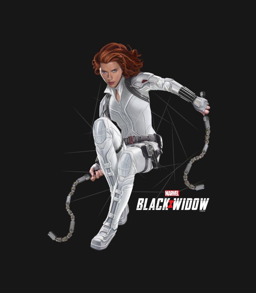 Black Widow – Featuring Scarlett Johansson as Black Widow – Black Widow in her white outfit holding batons in both hands. PNG Free Download