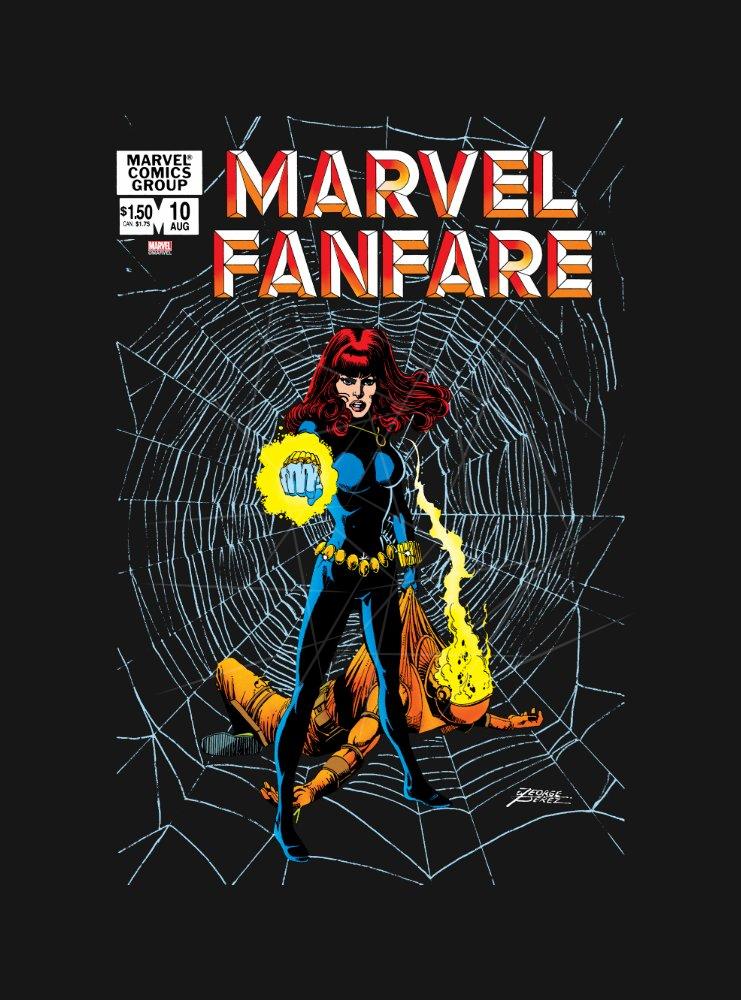 This classic Marvel Fanfare Vol. 1 comic issue #10 book cover – Widow – features Black Widow capturing an unfortunate tear-gassed villain in her web. PNG Free Download