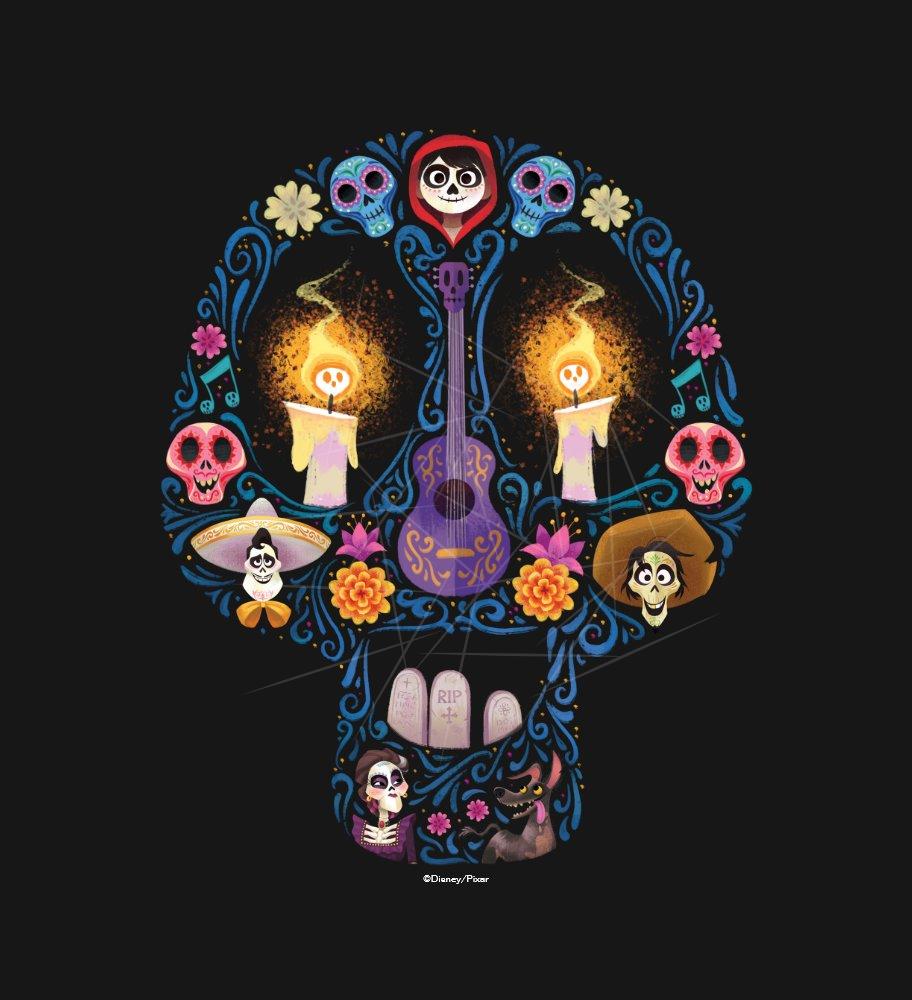 This cool sugar skull design features all of your favorite characters from Disney/Pixar’s Coco. Miguel, Ernesto, Hector and even Dante have arrived in a fun, colorful graphic that is sure to inspire. Music, family and the indigenous cultures of Mexico are the core themes explored in the exciting kid’s movie. Featuring guitars, flowers and even ghosts styled as candles, this fun graphic will appeal to fans of the musical fantasy film. PNG Free Download